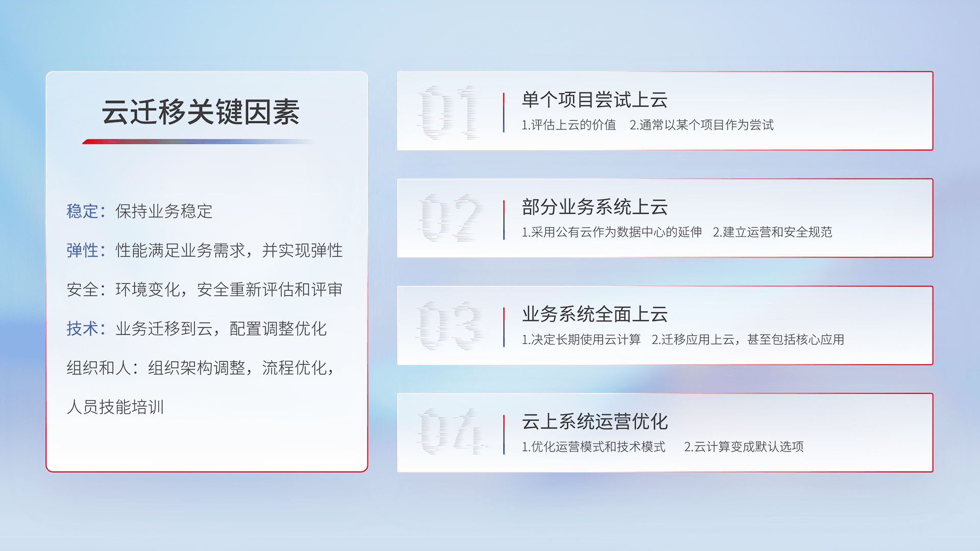 结合实际业务,,从规划设计、、、、云平台选型、、、、云原生改造、、、数据迁移、、、集成交付,,迁移全过程为客户识别最佳上云路径,,,,做好风险识别管理,,,设计网络架构、、、、身份权限、、、、安全审计合规、、、、操作审计、、、、日志审计、、、、监控告警策略、、多站点容灾设计等,,对云上基础设施进行整体规划,,,提升IT治理水平,,以满足弹性、、高可用、、高性能的需求。。。